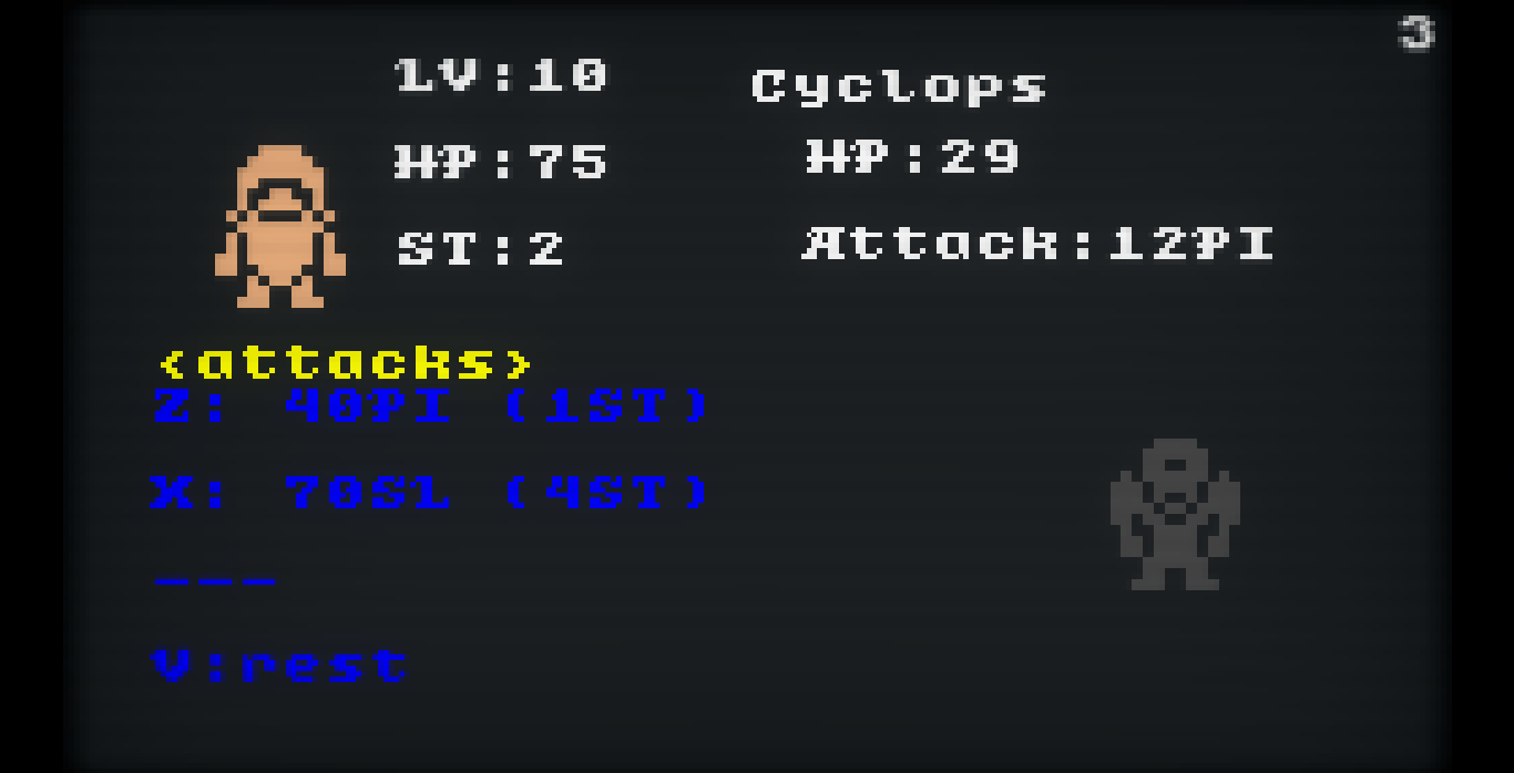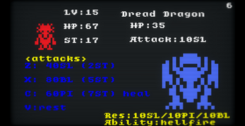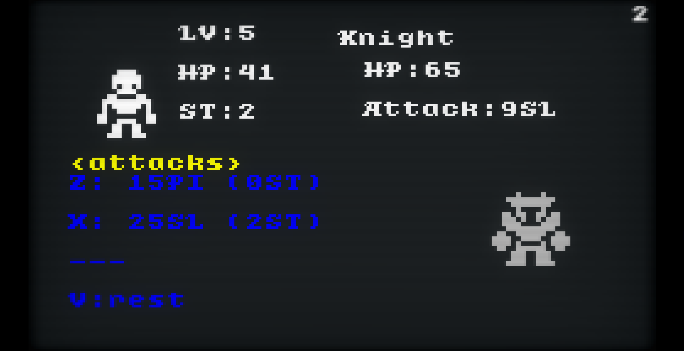 The player has 2 attacks (or 3 at a higher level), conditional to the player's weapon. These weapons vary from the classic swords to the unusual whips. No matter what, though, the player always has a 4th option, rest, letting them recover all their lost stamina and making them see the enemy's ability and resistances.