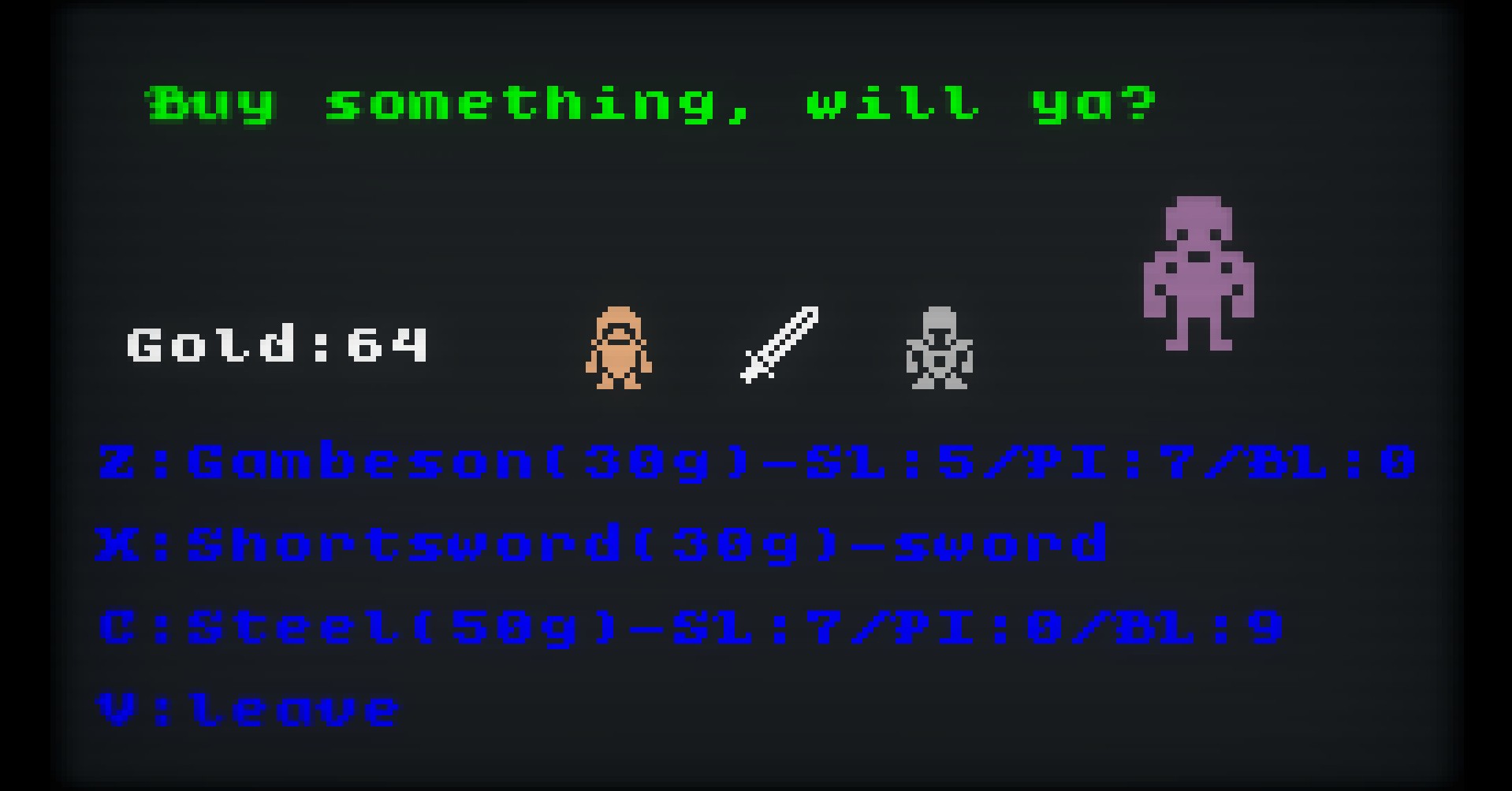 Enemies drop gold, and so do pouches. Gold can then be used to buy weapons, armor and throwables from NPCs with question marks on their heads.